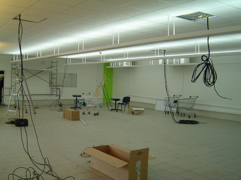Les luminaires existants ont été déposés et évacués. Des rampes lumineuses fournies par le client ont été mise en place et raccordées après reprise du câblage de l'éclairage.